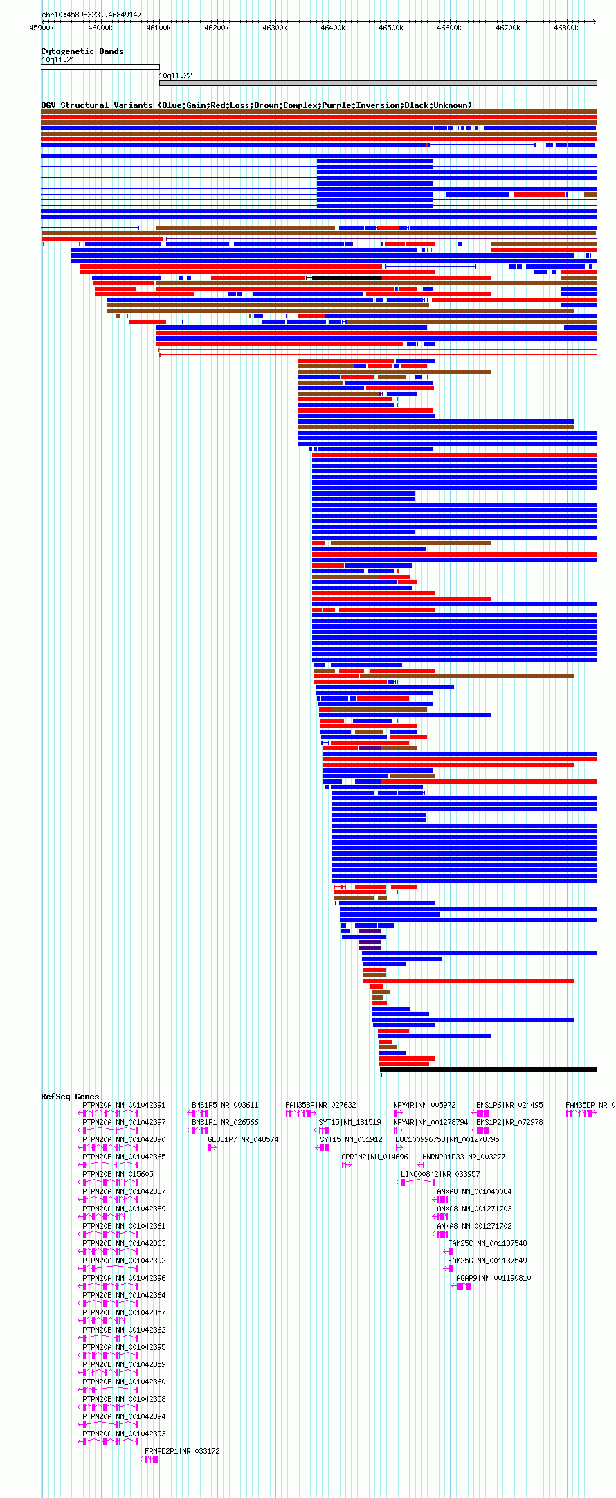 | | Variant Type | CNV gain+loss | | Copy Number | | | Allele State | | | Allele Origin | | | Probe Count | | | Validation Flag | | | Merged Status | M | | Merged Variants | | | Supporting Variants | esv20121, esv18141, esv18424, esv13897, esv16233, esv19313, esv14800, esv13211, esv12250, esv19573 | | Samples | NA18502, NA11995, NA18861, NA18508, NA11931, NA12004, NA19190, NA12287, NA12044, NA12828, NA11993, NA12489, NA12878, NA18907, NA07045, NA19114, NA11894, NA15510, NA19099, NA19257, NA19225, NA06985, NA18523, NA18858, NA18909, NA19147, NA18517, NA19240, NA07037, NA18505, NA19129, NA12006, NA12776 | | Known Genes | AGAP9, ANXA8, BMS1P1, BMS1P2, BMS1P5, BMS1P6, FAM25C, FAM25G, FAM35BP, FAM35DP, FRMPD2P1, GLUD1P7, GPRIN2, HNRNPA1P33, LINC00842, LOC100996758, NPY4R, PTPN20A, PTPN20B, SYT15 | | Method | Oligo aCGH | | Analysis | Segment log2 ratios from each sample. This was done running the GADA algorithm (Pique-Regi et al., 2008) using the options "-M 10 -T 10 -a 2.5". Filter non-CNV segments using intensity thresholds. Merge remaining CNV "calls" within each sample. Adjacent calls of the same direction (gain or loss) are merged if both: the distance between calls is less than 10kb, and the distance between calls is less than 10% of the size of the largest of the two calls. | | Platform | Sanger H. Sapiens 42mCGH Array 5781_53 726K v1 | | Comments | | | Reference | Conrad_et_al_2009 | | Pubmed ID | 19812545 | | Accession Number(s) | esv22204