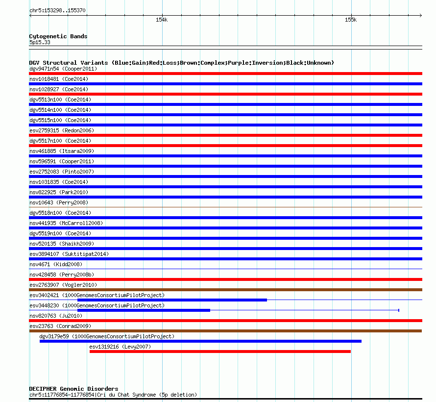 Variant DetailsVariant: esv23763 | Internal ID | 11040996 | | Landmark | | | Location Information | | | Cytoband | 5p15.33 | | Allele length | | Assembly | Allele length | | hg38 | 2073 | | hg19 | 2073 | | hg18 | 2073 |