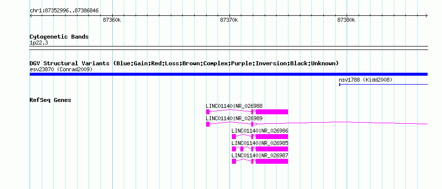 | | Variant Type | CNV gain | | Copy Number | | | Allele State | | | Allele Origin | | | Probe Count | | | Validation Flag | | | Merged Status | M | | Merged Variants | | | Supporting Variants | esv16675, esv11592 | | Samples | NA12414, NA12156, NA11993, NA19257, NA18858, NA19147 | | Known Genes | LINC01140 | | Method | Oligo aCGH | | Analysis | Segment log2 ratios from each sample. This was done running the GADA algorithm (Pique-Regi et al., 2008) using the options "-M 10 -T 10 -a 2.5". Filter non-CNV segments using intensity thresholds. Merge remaining CNV "calls" within each sample. Adjacent calls of the same direction (gain or loss) are merged if both: the distance between calls is less than 10kb, and the distance between calls is less than 10% of the size of the largest of the two calls. | | Platform | Sanger H. Sapiens 42mCGH Array 5781_53 726K v1 | | Comments | | | Reference | Conrad_et_al_2009 | | Pubmed ID | 19812545 | | Accession Number(s) | esv23870