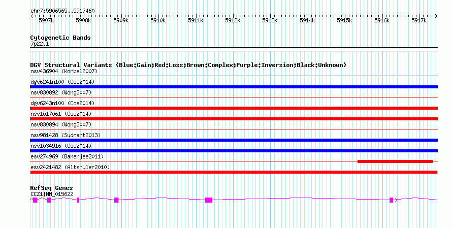 Variant DetailsVariant: esv2421482| Internal ID | 8251930 | | Landmark | | | Location Information | | | Cytoband | 7p22.1 | | Allele length | | Assembly | Allele length | | hg38 | 10896 | | hg19 | 10896 | | hg18 | 10896 |