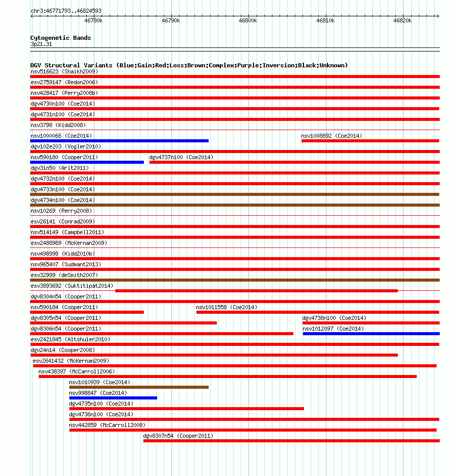 Variant DetailsVariant: esv2421845 | Internal ID | 7905607 | | Landmark | | | Location Information | | | Cytoband | 3p21.31 | | Allele length | | Assembly | Allele length | | hg38 | 52801 | | hg19 | 52801 | | hg18 | 52801 |