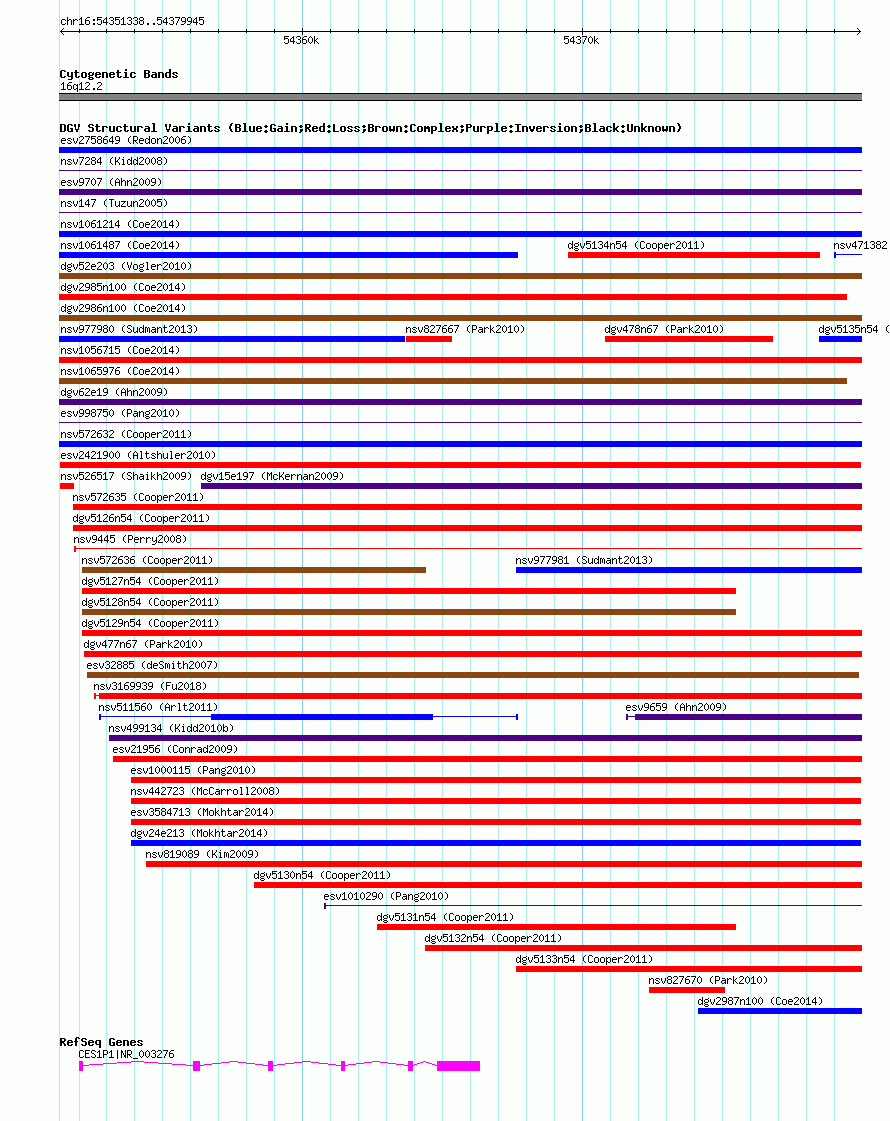 Variant DetailsVariant: esv2421900 | Internal ID | 8252348 | | Landmark | | | Location Information | | | Cytoband | 16q12.2 | | Allele length | | Assembly | Allele length | | hg38 | 28608 | | hg19 | 28608 | | hg18 | 28608 |