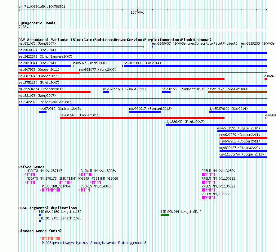 | Variant Type | CNV duplication | Copy Number | | Allele State | | Allele Origin | | Probe Count | | Validation Flag | | Merged Status | M | Merged Variants | | Supporting Variants | essv5161511 | Samples | ND04296 | Known Genes | CLDN15, FIS1, MOGAT3, PLOD3, RABL5, ZNHIT1 | Method | SNP array | Analysis | log R ratio and B allele frequency. | Platform | Not specified | Comments | | Reference | Simon-Sanchez_et_al_2007 | Pubmed ID | 17116639 | Accession Number(s) | esv2422326