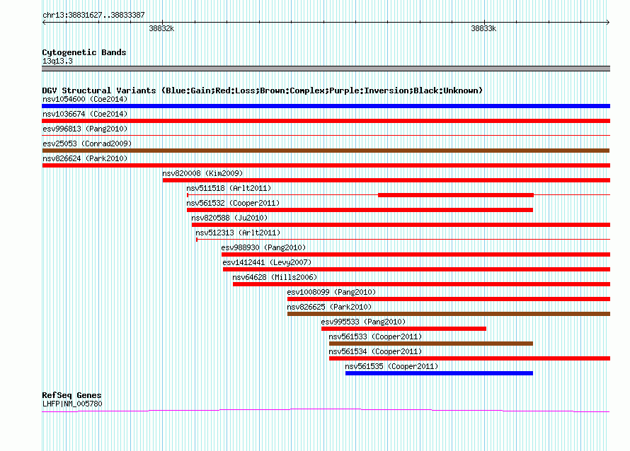 Variant DetailsVariant: esv25053 | Internal ID | 11388972 | | Landmark | | | Location Information | | | Cytoband | 13q13.3 | | Allele length | | Assembly | Allele length | | hg38 | 1761 | | hg19 | 1761 | | hg18 | 1761 |