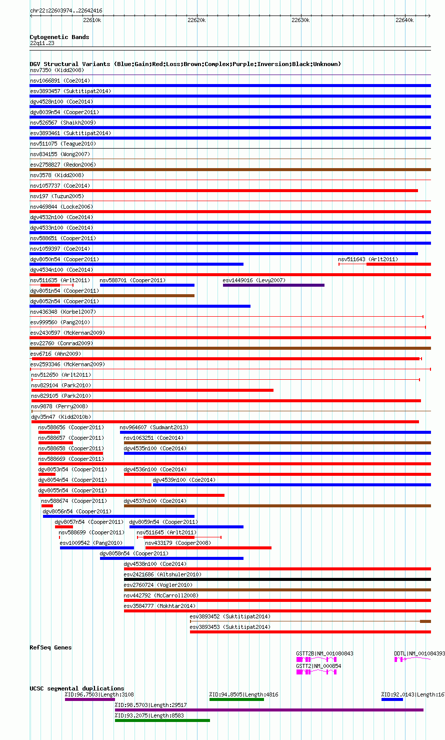 Variant DetailsVariant: esv2593346| Internal ID | 8310219 | | Landmark | | | Location Information | | | Cytoband | 22q11.23 | | Allele length | | Assembly | Allele length | | hg38 | 38441 | | hg19 | 38443 | | hg18 | 38443 |