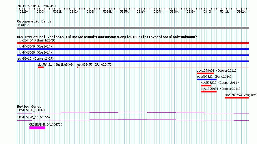 | | Variant Type | CNV gain | | Copy Number | | | Allele State | | | Allele Origin | | | Probe Count | | | Validation Flag | | | Merged Status | M | | Merged Variants | | | Supporting Variants | esv18780, esv18784, esv21298 | | Samples | NA11995, NA18861, NA18508, NA12414, NA12004, NA19190, NA18916, NA12287, NA12044, NA12828, NA11993, NA12878, NA07045, NA19114, NA11894, NA12239, NA19257, NA19225, NA06985, NA18523, NA18858, NA18909, NA19108, NA19240, NA07037, NA12749, NA19129, NA12006, NA18511 | | Known Genes | OR51B5, OR51B6 | | Method | Oligo aCGH | | Analysis | Segment log2 ratios from each sample. This was done running the GADA algorithm (Pique-Regi et al., 2008) using the options "-M 10 -T 10 -a 2.5". Filter non-CNV segments using intensity thresholds. Merge remaining CNV "calls" within each sample. Adjacent calls of the same direction (gain or loss) are merged if both: the distance between calls is less than 10kb, and the distance between calls is less than 10% of the size of the largest of the two calls. | | Platform | Sanger H. Sapiens 42mCGH Array 5781_53 726K v1 | | Comments | | | Reference | Conrad_et_al_2009 | | Pubmed ID | 19812545 | | Accession Number(s) | esv26010