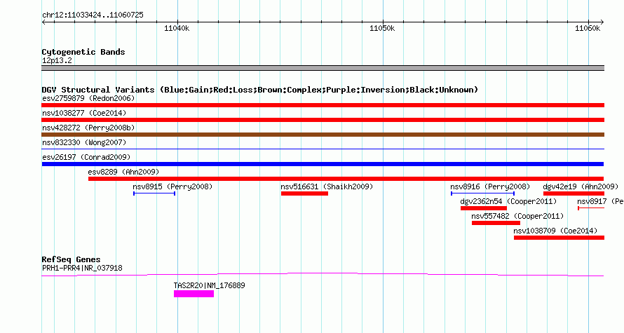 Variant DetailsVariant: esv26197 | Internal ID | 11390116 | | Landmark | | | Location Information | | | Cytoband | 12p13.2 | | Allele length | | Assembly | Allele length | | hg38 | 27302 | | hg19 | 27302 | | hg18 | 27302 |