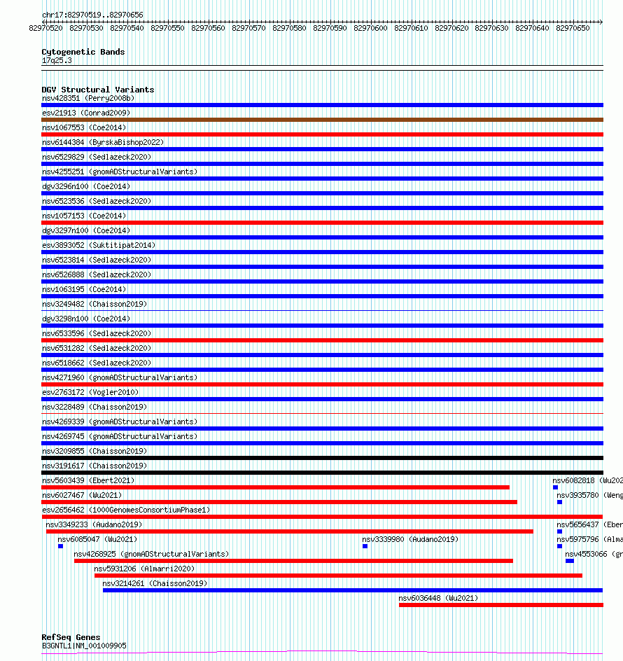 Variant DetailsVariant: esv2656462 | Internal ID | 9922567 | | Landmark | | | Location Information | | | Cytoband | 17q25.3 | | Allele length | | Assembly | Allele length | | hg38 | 138 | | hg19 | 138 |