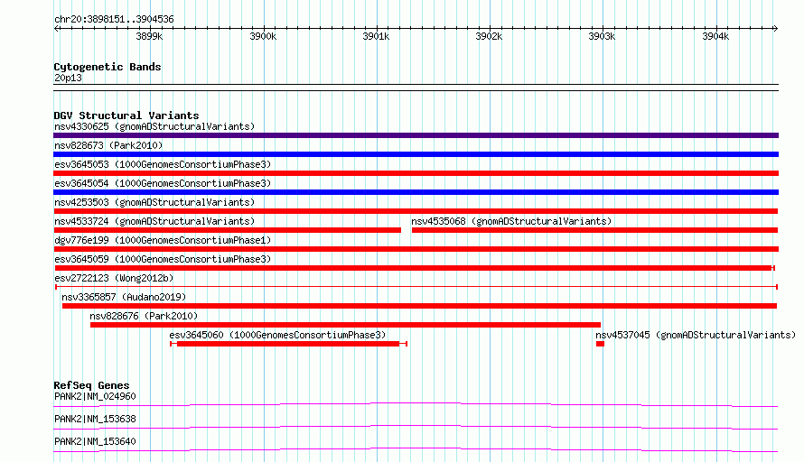 | | Variant Type | CNV deletion | | Copy Number | | | Allele State | | | Allele Origin | | | Probe Count | | | Validation Flag | | | Merged Status | M | | Merged Variants | dgv776e199 | | Supporting Variants | essv6334184, essv5994379, essv5809203, essv6495892, essv6387445, essv5658787, essv5825782 | | Samples | HG01188, NA19684, NA19720, HG00268, NA19783, HG00312, NA19726 | | Known Genes | PANK2 | | Method | Merging | | Analysis | No reference, merging analysis | | Platform | Merging | | Comments | | | Reference | 1000_Genomes_Consortium_Phase_1 | | Pubmed ID | 23128226 | | Accession Number(s) | esv2656799
