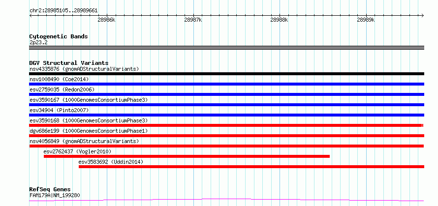 | | Variant Type | CNV deletion | | Copy Number | | | Allele State | | | Allele Origin | | | Probe Count | | | Validation Flag | | | Merged Status | M | | Merged Variants | dgv686e199 | | Supporting Variants | essv6318135, essv5605638 | | Samples | NA20809, NA19663 | | Known Genes | FAM179A | | Method | Merging | | Analysis | No reference, merging analysis | | Platform | Merging | | Comments | High quality site | | Reference | 1000_Genomes_Consortium_Phase_1 | | Pubmed ID | 23128226 | | Accession Number(s) | esv2656936