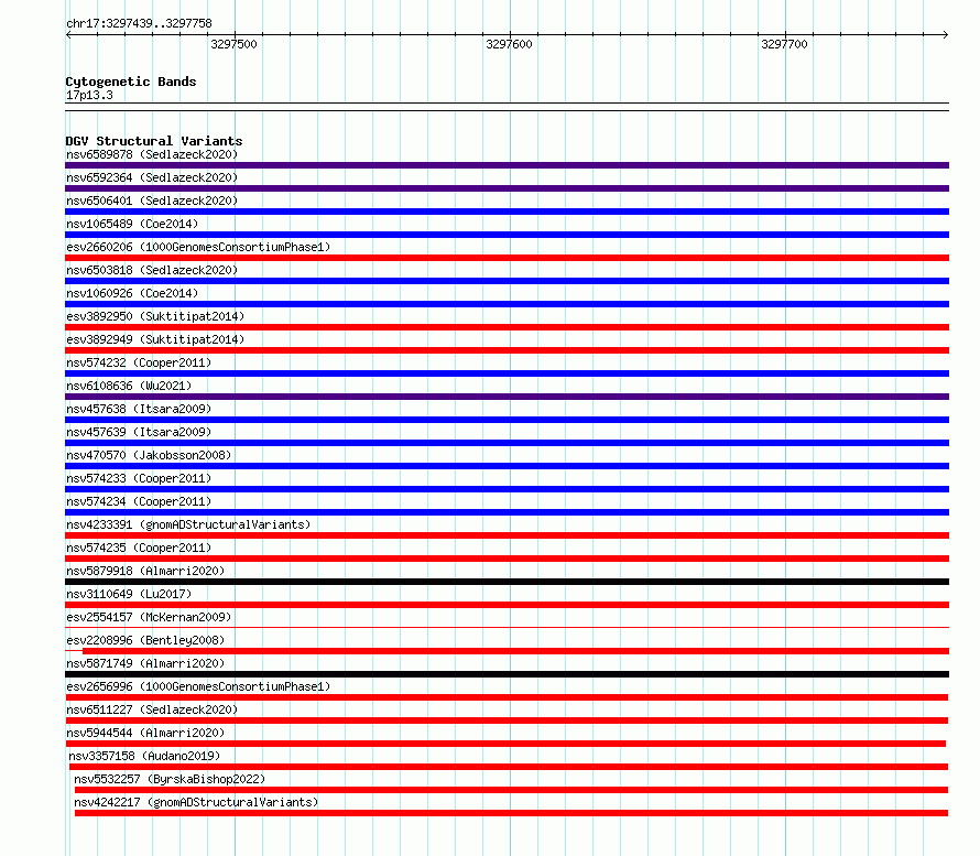 Variant DetailsVariant: esv2656996 | Internal ID | 9923101 | | Landmark | | | Location Information | | | Cytoband | 17p13.3 | | Allele length | | Assembly | Allele length | | hg38 | 320 | | hg19 | 320 |