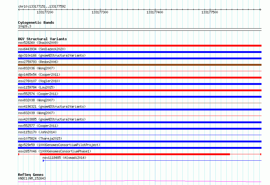 Variant DetailsVariant: esv2657046 | Internal ID | 9923151 | | Landmark | | | Location Information | | | Cytoband | 10q26.3 | | Allele length | | Assembly | Allele length | | hg38 | 442 | | hg19 | 442 |