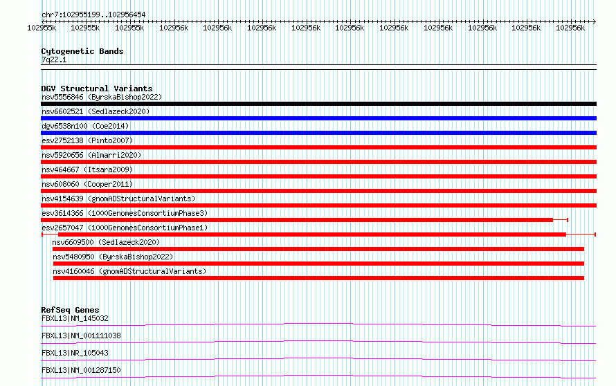 Variant DetailsVariant: esv2657047| Internal ID | 9923152 | | Landmark | | | Location Information | | | Cytoband | 7q22.1 | | Allele length | | Assembly | Allele length | | hg38 | 1256 | | hg19 | 1256 |