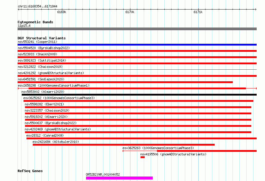 Variant DetailsVariant: esv2658298| Internal ID | 9924403 | | Landmark | | | Location Information | | | Cytoband | 11p15.4 | | Allele length | | Assembly | Allele length | | hg38 | 3491 | | hg19 | 3491 |