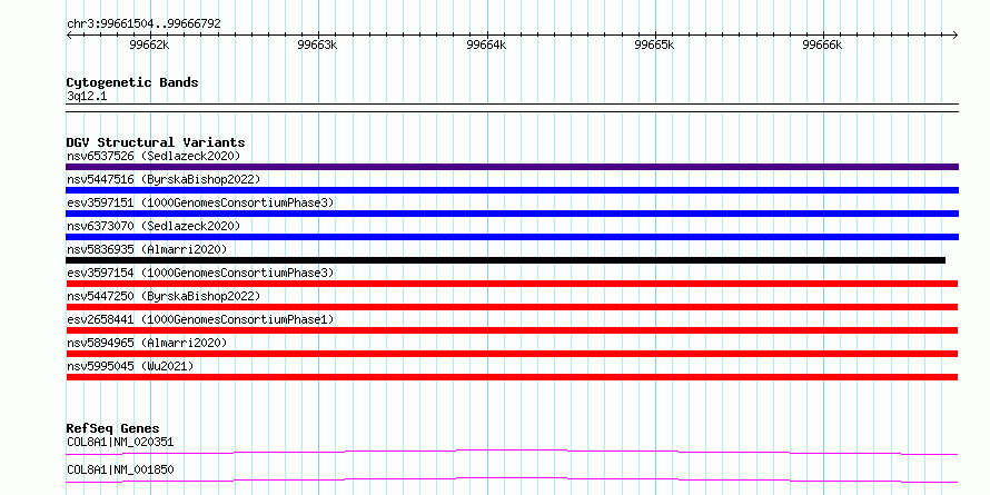 | | Variant Type | CNV deletion | | Copy Number | | | Allele State | | | Allele Origin | | | Probe Count | | | Validation Flag | | | Merged Status | M | | Merged Variants | | | Supporting Variants | essv5530599 | | Samples | NA18553 | | Known Genes | COL8A1, MIR548G | | Method | Merging | | Analysis | No reference, merging analysis | | Platform | Merging | | Comments | High quality site | | Reference | 1000_Genomes_Consortium_Phase_1 | | Pubmed ID | 23128226 | | Accession Number(s) | esv2658441