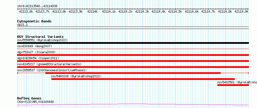 Variant DetailsVariant: esv2658537| Internal ID | 9924642 | | Landmark | | | Location Information | | | Cytoband | 6p21.1 | | Allele length | | Assembly | Allele length | | hg38 | 1394 | | hg19 | 1394 |