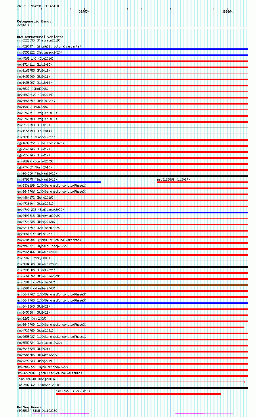 Variant DetailsVariant: esv2658587| Internal ID | 9924692 | | Landmark | | | Location Information | | | Cytoband | 22q13.1 | | Allele length | | Assembly | Allele length | | hg38 | 1608 | | hg19 | 1608 |