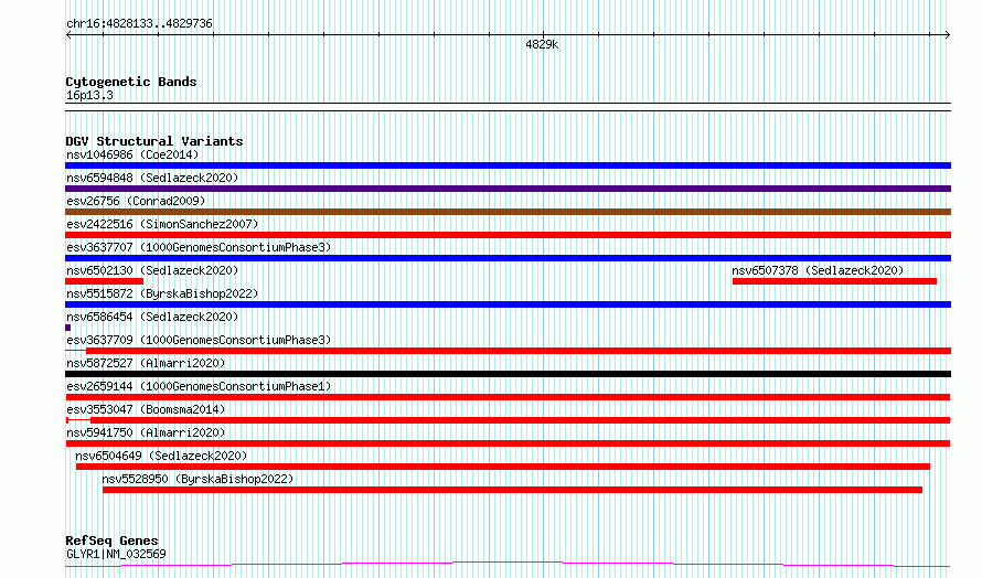 Variant DetailsVariant: esv2659144| Internal ID | 9925249 | | Landmark | | | Location Information | | | Cytoband | 16p13.3 | | Allele length | | Assembly | Allele length | | hg38 | 1604 | | hg19 | 1604 |