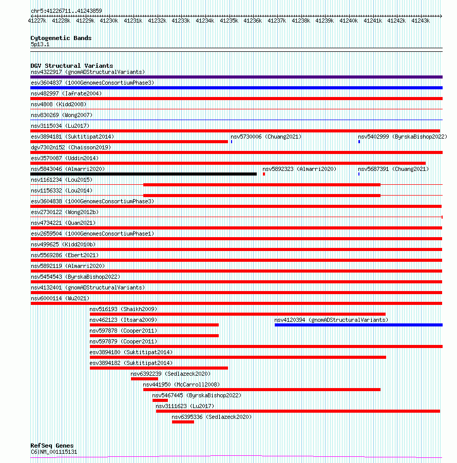 Variant DetailsVariant: esv2659504| Internal ID | 9925609 | | Landmark | | | Location Information | | | Cytoband | 5p13.1 | | Allele length | | Assembly | Allele length | | hg38 | 17149 | | hg19 | 17149 |