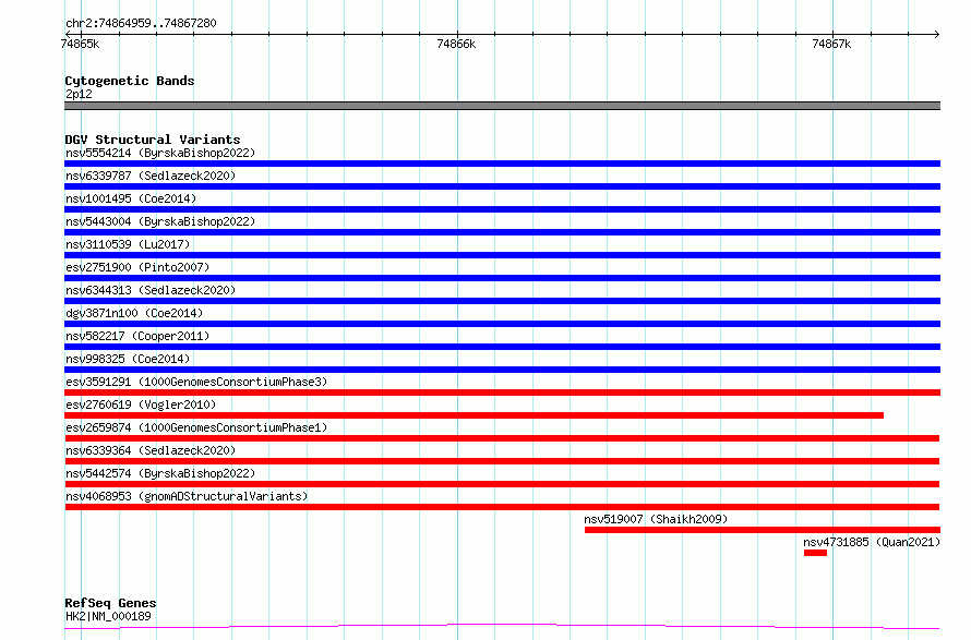 | | Variant Type | CNV deletion | | Copy Number | | | Allele State | | | Allele Origin | | | Probe Count | | | Validation Flag | | | Merged Status | M | | Merged Variants | | | Supporting Variants | essv6077194, essv6310203 | | Samples | NA19437, NA18873 | | Known Genes | HK2 | | Method | Merging | | Analysis | No reference, merging analysis | | Platform | Merging | | Comments | High quality site | | Reference | 1000_Genomes_Consortium_Phase_1 | | Pubmed ID | 23128226 | | Accession Number(s) | esv2659874