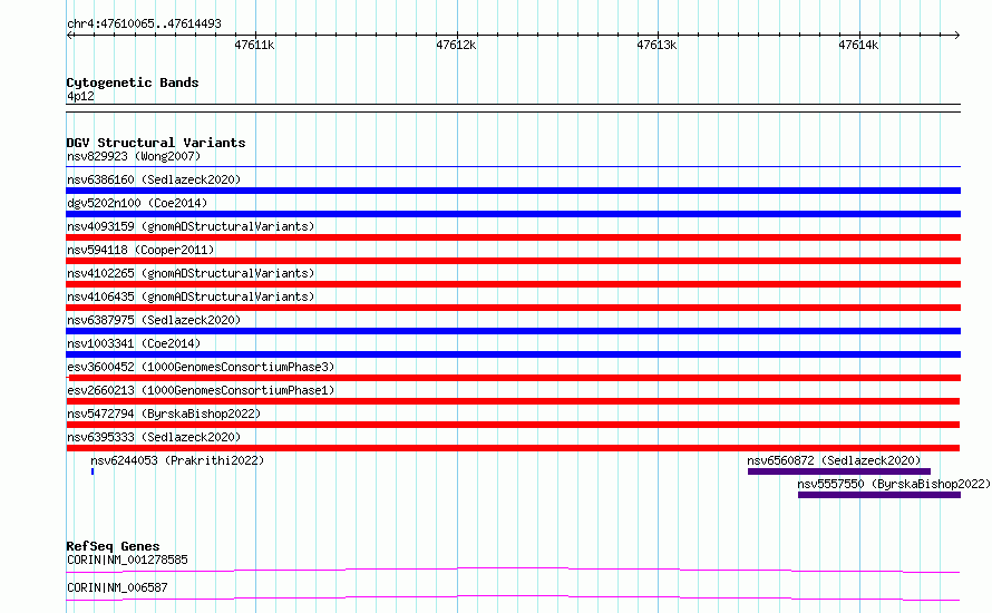 | | Variant Type | CNV deletion | | Copy Number | | | Allele State | | | Allele Origin | | | Probe Count | | | Validation Flag | | | Merged Status | M | | Merged Variants | | | Supporting Variants | essv5590714, essv6016082 | | Samples | HG00699, NA18636 | | Known Genes | CORIN | | Method | Merging | | Analysis | No reference, merging analysis | | Platform | Merging | | Comments | High quality site | | Reference | 1000_Genomes_Consortium_Phase_1 | | Pubmed ID | 23128226 | | Accession Number(s) | esv2660213