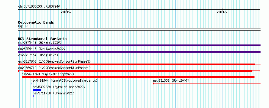 Variant DetailsVariant: esv2660712| Internal ID | 9926817 | | Landmark | | | Location Information | | | Cytoband | 8q13.3 | | Allele length | | Assembly | Allele length | | hg38 | 1548 | | hg19 | 1548 |