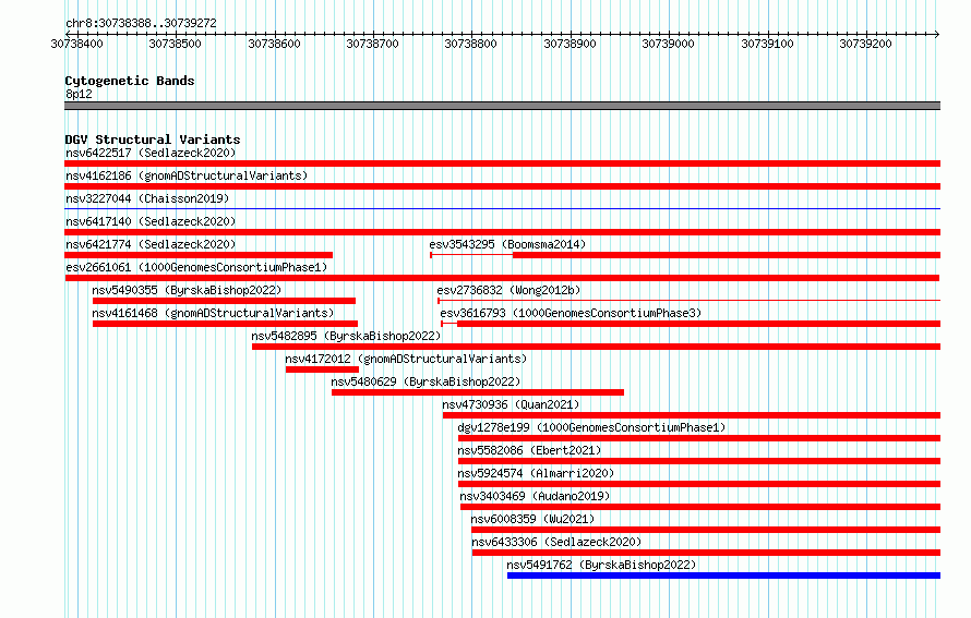 Variant DetailsVariant: esv2661061 | Internal ID | 9927166 | | Landmark | | | Location Information | | | Cytoband | 8p12 | | Allele length | | Assembly | Allele length | | hg38 | 885 | | hg19 | 885 |