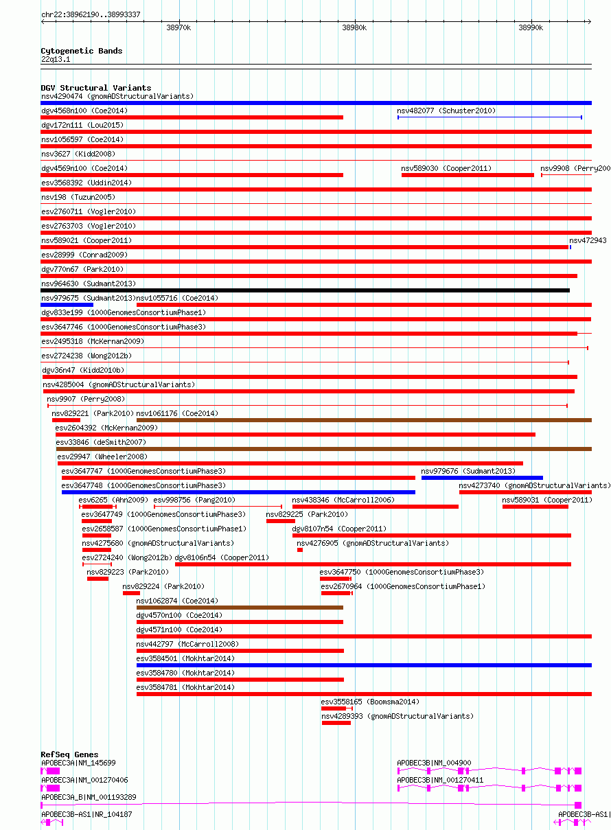 Variant DetailsVariant: esv2661117 Internal ID | 9580536 | Landmark | | Location Information | | Cytoband | 22q13.1 | Allele length | Assembly | Allele length | hg38 | 31148 | hg19 | 31148 |