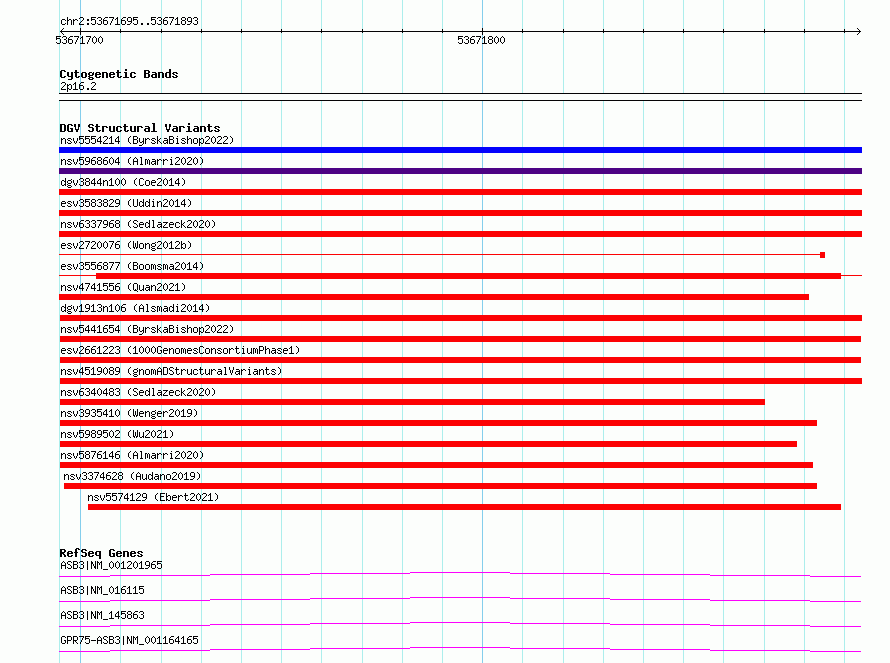 Variant DetailsVariant: esv2661223 | Internal ID | 9927328 | | Landmark | | | Location Information | | | Cytoband | 2p16.2 | | Allele length | | Assembly | Allele length | | hg38 | 199 | | hg19 | 199 |