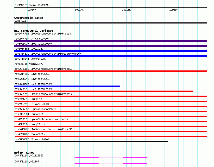 Variant DetailsVariant: esv2661548| Internal ID | 9927653 | | Landmark | | | Location Information | | | Cytoband | 19p13.12 | | Allele length | | Assembly | Allele length | | hg38 | 4074 | | hg19 | 4074 |