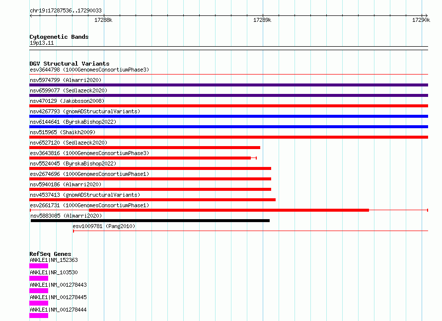 Variant DetailsVariant: esv2661731 | Internal ID | 9927836 | | Landmark | | | Location Information | | | Cytoband | 19p13.11 | | Allele length | | Assembly | Allele length | | hg38 | 2498 | | hg19 | 2498 |