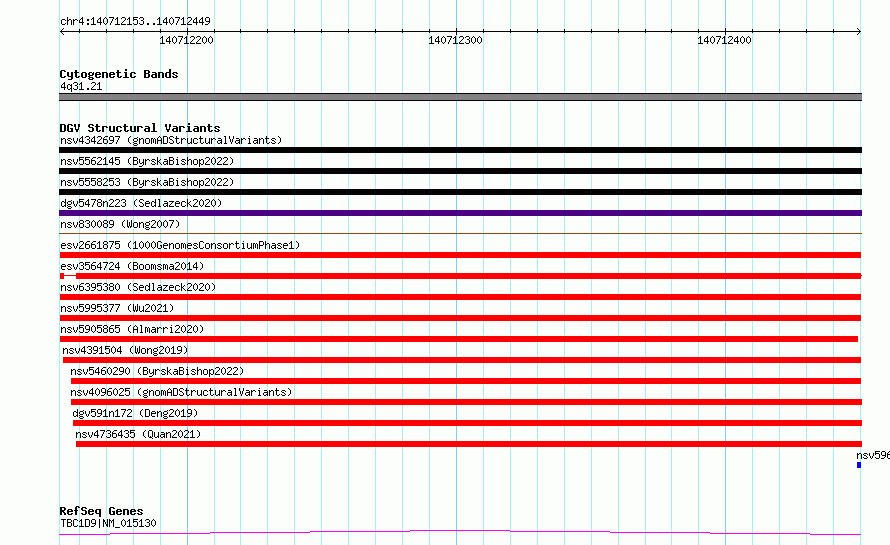 | | Variant Type | CNV deletion | | Copy Number | | | Allele State | | | Allele Origin | | | Probe Count | | | Validation Flag | | | Merged Status | M | | Merged Variants | | | Supporting Variants | essv6247451, essv6124723, essv5423907, essv5610207, essv6410271, essv5602810, essv5412922, essv6296814, essv6003968, essv5977187, essv6257511, essv5545515, essv6228933, essv5757996, essv5464650, essv5988909, essv5594653, essv6262949, essv6343937, essv5938262, essv6165436, essv5853606, essv6374241, essv6423000, essv5603058, essv6397005, essv6403915, essv6209945, essv5461347, essv6369498, essv6300277, essv6504505, essv6186971, essv5687890, essv5405723 | | Samples | HG00592, NA18999, HG01456, NA19443, NA19067, NA18563, NA19076, HG01488, NA19723, NA18960, NA19771, NA19088, NA18498, NA19681, NA18949, HG01198, NA19403, NA19663, NA19081, NA19788, NA19776, HG01497, NA19009, NA18963, HG00463, NA19685, NA18961, NA18950, HG01551, NA19783, NA19759, NA18609, NA19780, NA19661, HG01082 | | Known Genes | TBC1D9 | | Method | Merging | | Analysis | No reference, merging analysis | | Platform | Merging | | Comments | | | Reference | 1000_Genomes_Consortium_Phase_1 | | Pubmed ID | 23128226 | | Accession Number(s) | esv2661875