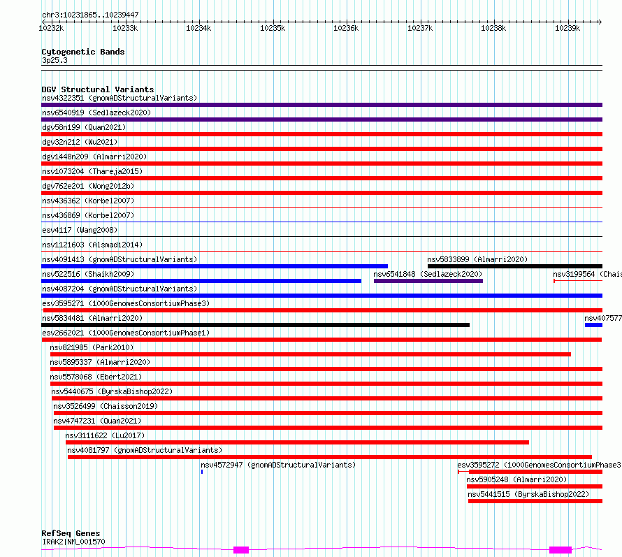 Variant DetailsVariant: esv2662021| Internal ID | 9928126 | | Landmark | | | Location Information | | | Cytoband | 3p25.3 | | Allele length | | Assembly | Allele length | | hg38 | 7583 | | hg19 | 7583 |