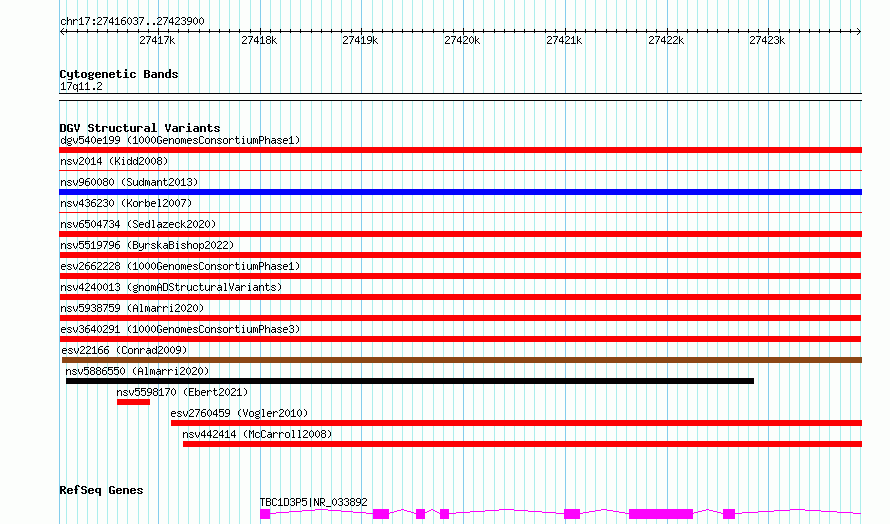Variant DetailsVariant: esv2662228| Internal ID | 9928333 | | Landmark | | | Location Information | | | Cytoband | 17q11.1 | | Allele length | | Assembly | Allele length | | hg38 | 7864 | | hg19 | 7864 |