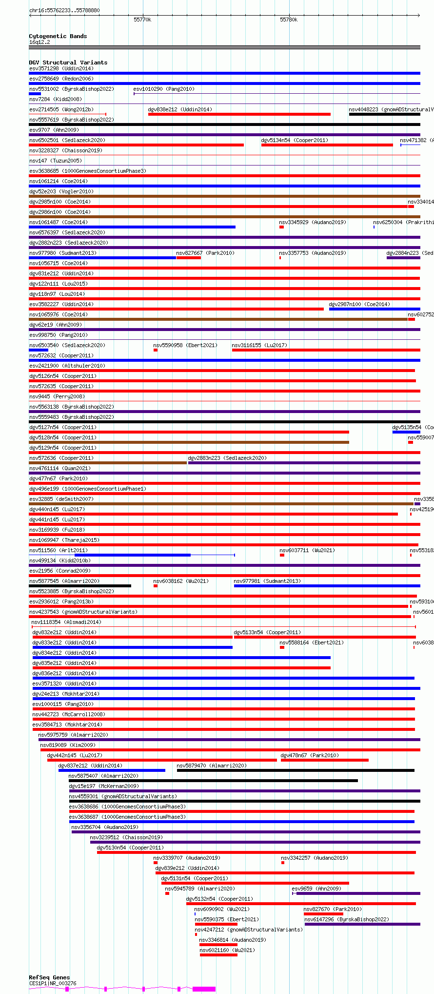 Variant DetailsVariant: esv2662252 | Internal ID | 9928357 | | Landmark | | | Location Information | | | Cytoband | 16q12.2 | | Allele length | | Assembly | Allele length | | hg38 | 26648 | | hg19 | 26648 |