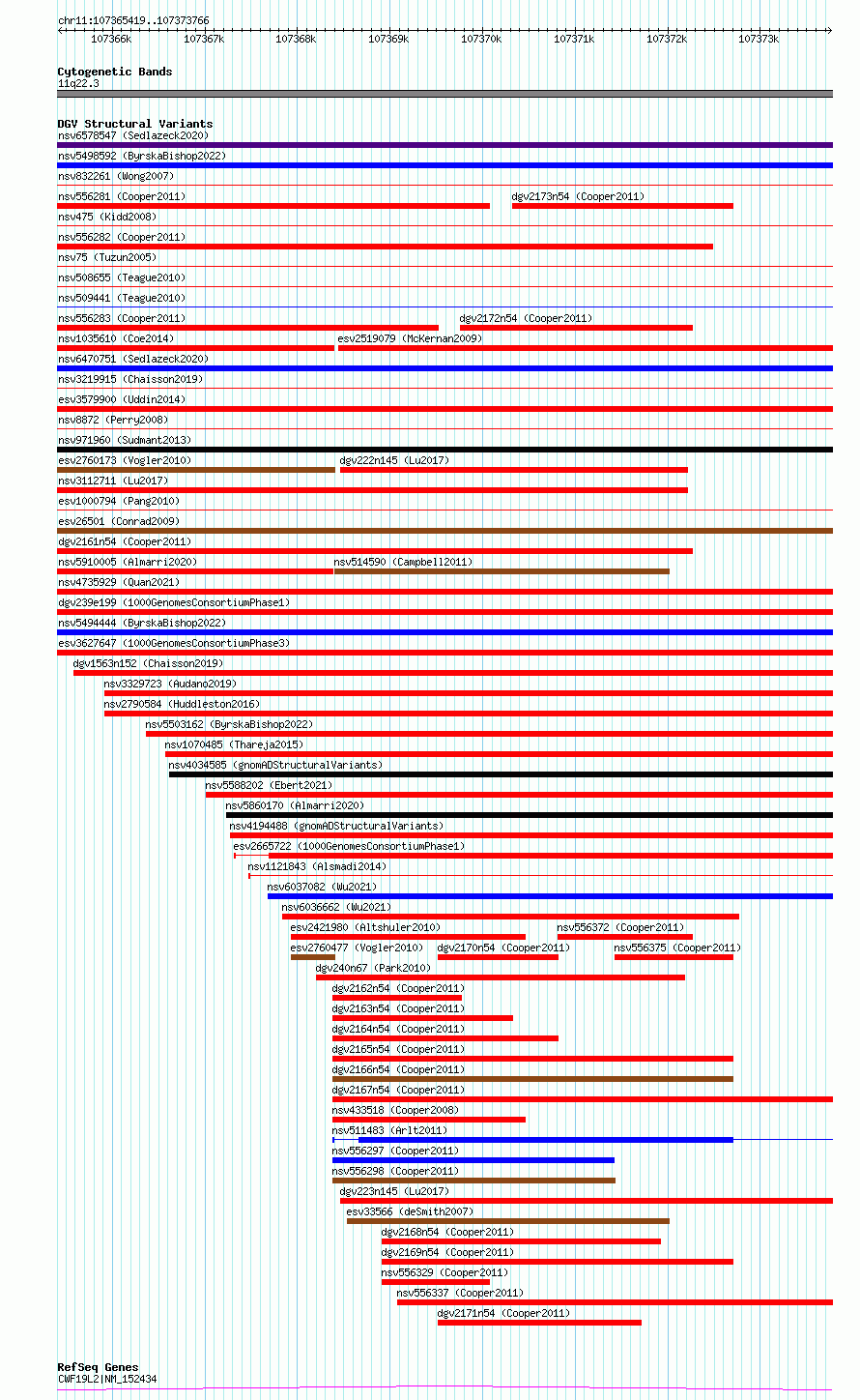 Variant DetailsVariant: esv2662324| Internal ID | 9928429 | | Landmark | | | Location Information | | | Cytoband | 11q22.3 | | Allele length | | Assembly | Allele length | | hg38 | 8348 | | hg19 | 8348 |