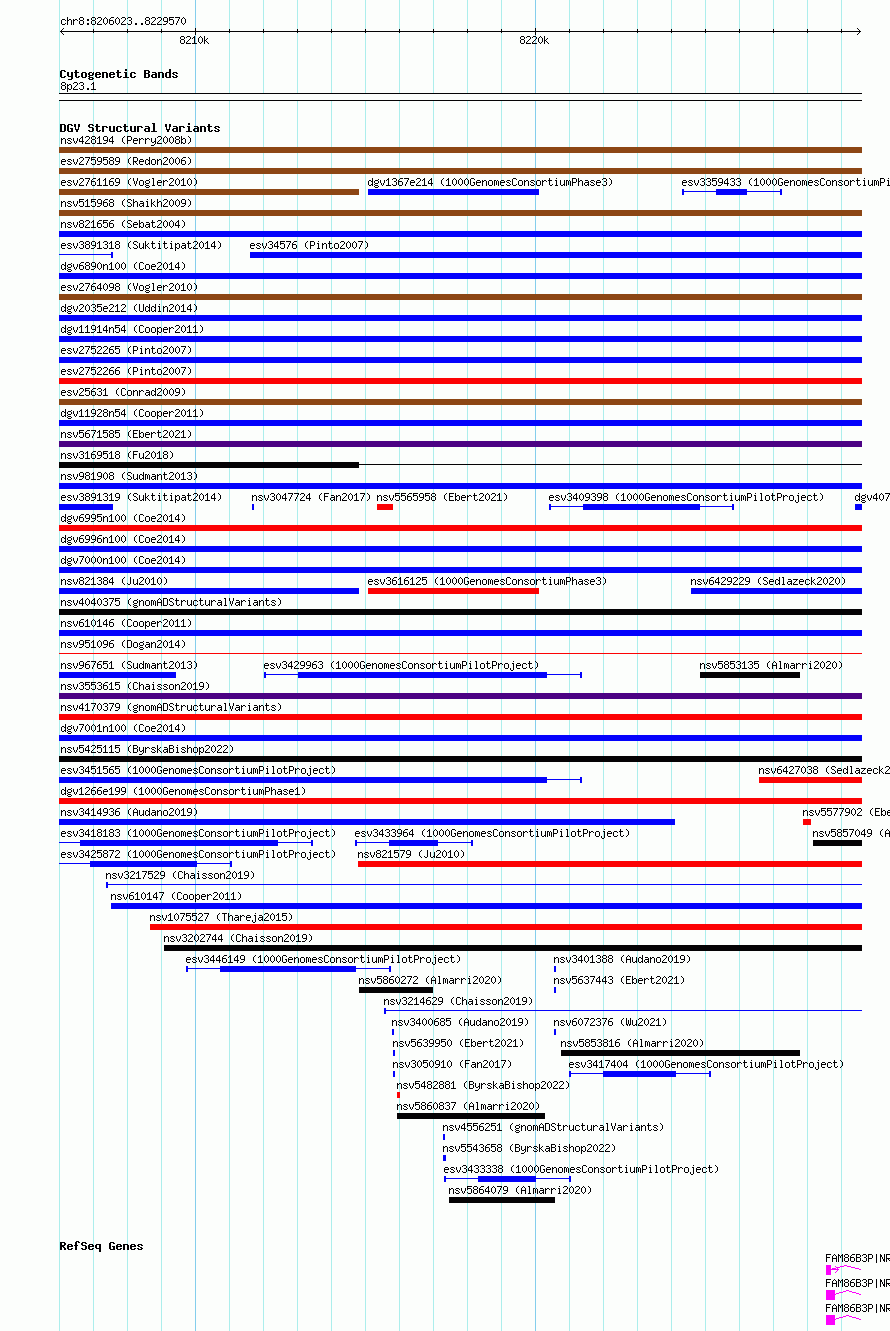 Variant DetailsVariant: esv2662425 | Internal ID | 9928530 | | Landmark | | | Location Information | | | Cytoband | 8p23.1 | | Allele length | | Assembly | Allele length | | hg38 | 23548 | | hg19 | 23548 |