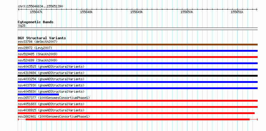 Variant DetailsVariant: esv2662461| Internal ID | 9581880 | | Landmark | | | Location Information | | | Cytoband | Xq28 | | Allele length | | Assembly | Allele length | | hg38 | 4757 | | hg19 | 4757 |