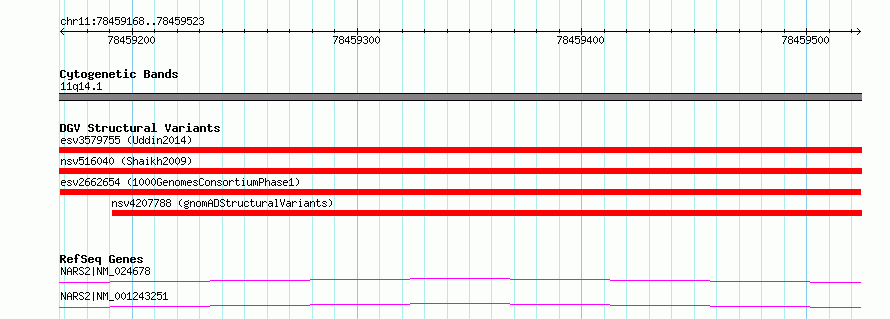 Variant DetailsVariant: esv2662654| Internal ID | 9582073 | | Landmark | | | Location Information | | | Cytoband | 11q14.1 | | Allele length | | Assembly | Allele length | | hg38 | 356 | | hg19 | 356 |