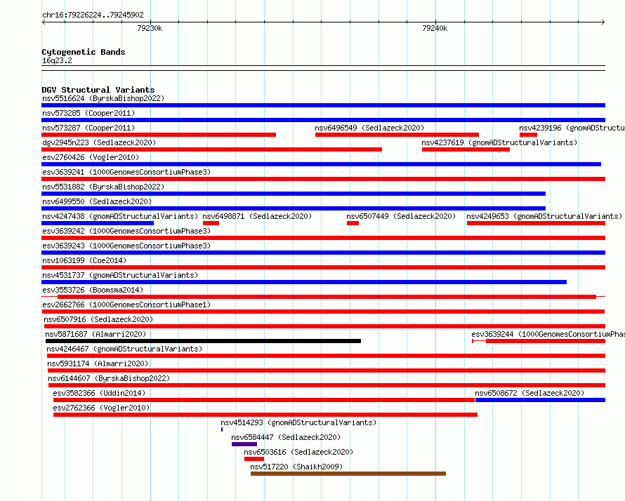 Variant DetailsVariant: esv2662766| Internal ID | 9928871 | | Landmark | | | Location Information | | | Cytoband | 16q23.2 | | Allele length | | Assembly | Allele length | | hg38 | 19679 | | hg19 | 19679 |