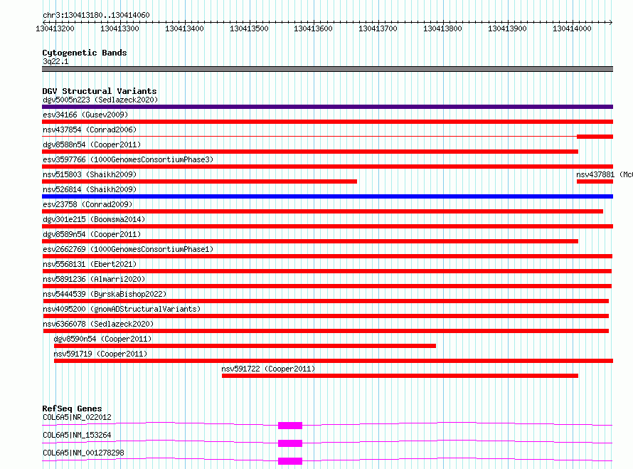 | | Variant Type | CNV deletion | | Copy Number | | | Allele State | | | Allele Origin | | | Probe Count | | | Validation Flag | | | Merged Status | M | | Merged Variants | | | Supporting Variants | essv6362945, essv6497198, essv6493818, essv5837115, essv6053529, essv6264755, essv5842936, essv6438912, essv6575779, essv5865300, essv6408583, essv5488022, essv6294987, essv6267924, essv6108349, essv5649220, essv6560355, essv6508834, essv5461668, essv5668686, essv6524900, essv5709072 | | Samples | HG00640, NA12751, NA20808, HG01351, NA19678, HG01488, NA12891, HG01492, NA20518, HG00106, HG00253, NA12003, NA12878, HG00344, HG00239, NA12892, HG00146, NA20828, HG00141, NA12043, HG00259, HG00267 | | Known Genes | COL6A5 | | Method | Merging | | Analysis | No reference, merging analysis | | Platform | Merging | | Comments | High quality site | | Reference | 1000_Genomes_Consortium_Phase_1 | | Pubmed ID | 23128226 | | Accession Number(s) | esv2662769