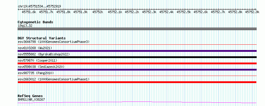 Variant DetailsVariant: esv2663012| Internal ID | 9929117 | | Landmark | | | Location Information | | | Cytoband | 19q13.32 | | Allele length | | Assembly | Allele length | | hg38 | 1386 | | hg19 | 1386 |