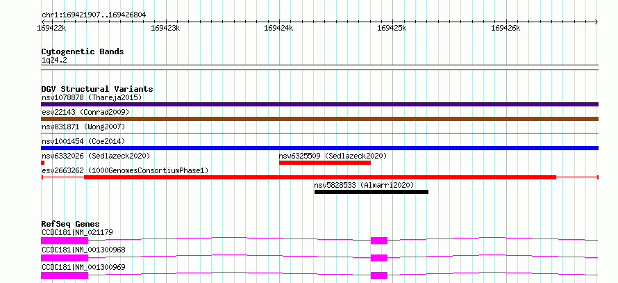 Variant DetailsVariant: esv2663262| Internal ID | 9929367 | | Landmark | | | Location Information | | | Cytoband | 1q24.2 | | Allele length | | Assembly | Allele length | | hg38 | 4898 | | hg19 | 4898 |