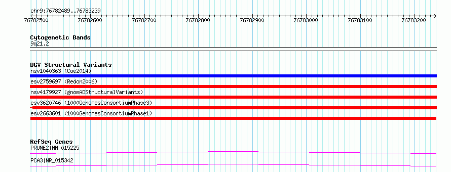 | | Variant Type | CNV deletion | | Copy Number | | | Allele State | | | Allele Origin | | | Probe Count | | | Validation Flag | | | Merged Status | M | | Merged Variants | | | Supporting Variants | essv6553361 | | Samples | NA19007 | | Known Genes | PCA3, PRUNE2 | | Method | Merging | | Analysis | No reference, merging analysis | | Platform | Merging | | Comments | High quality site | | Reference | 1000_Genomes_Consortium_Phase_1 | | Pubmed ID | 23128226 | | Accession Number(s) | esv2663601