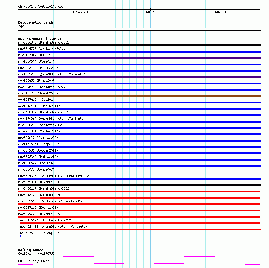 Variant DetailsVariant: esv2663669| Internal ID | 9929774 | | Landmark | | | Location Information | | | Cytoband | 7q22.1 | | Allele length | | Assembly | Allele length | | hg38 | 350 | | hg19 | 350 |