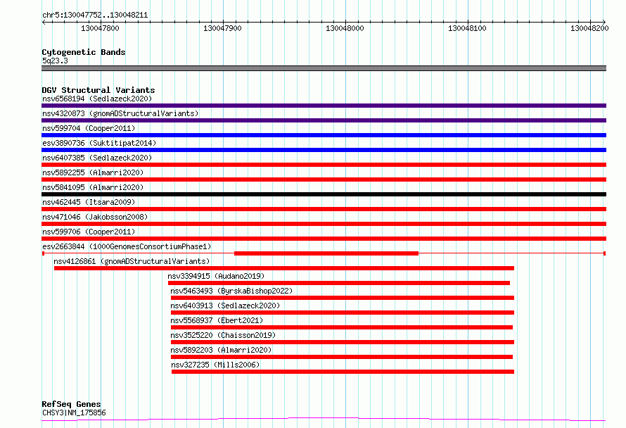 Variant DetailsVariant: esv2663844| Internal ID | 9929949 | | Landmark | | | Location Information | | | Cytoband | 5q23.3 | | Allele length | | Assembly | Allele length | | hg38 | 460 | | hg19 | 460 |