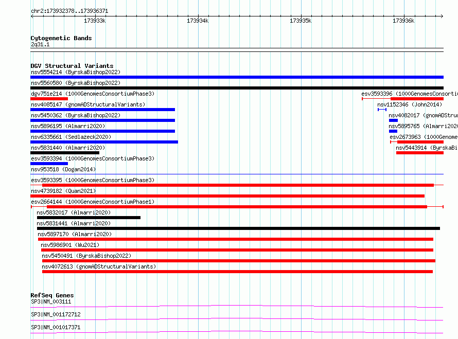Variant DetailsVariant: esv2664144| Internal ID | 9930249 | | Landmark | | | Location Information | | | Cytoband | 2q31.1 | | Allele length | | Assembly | Allele length | | hg38 | 3994 | | hg19 | 3994 |