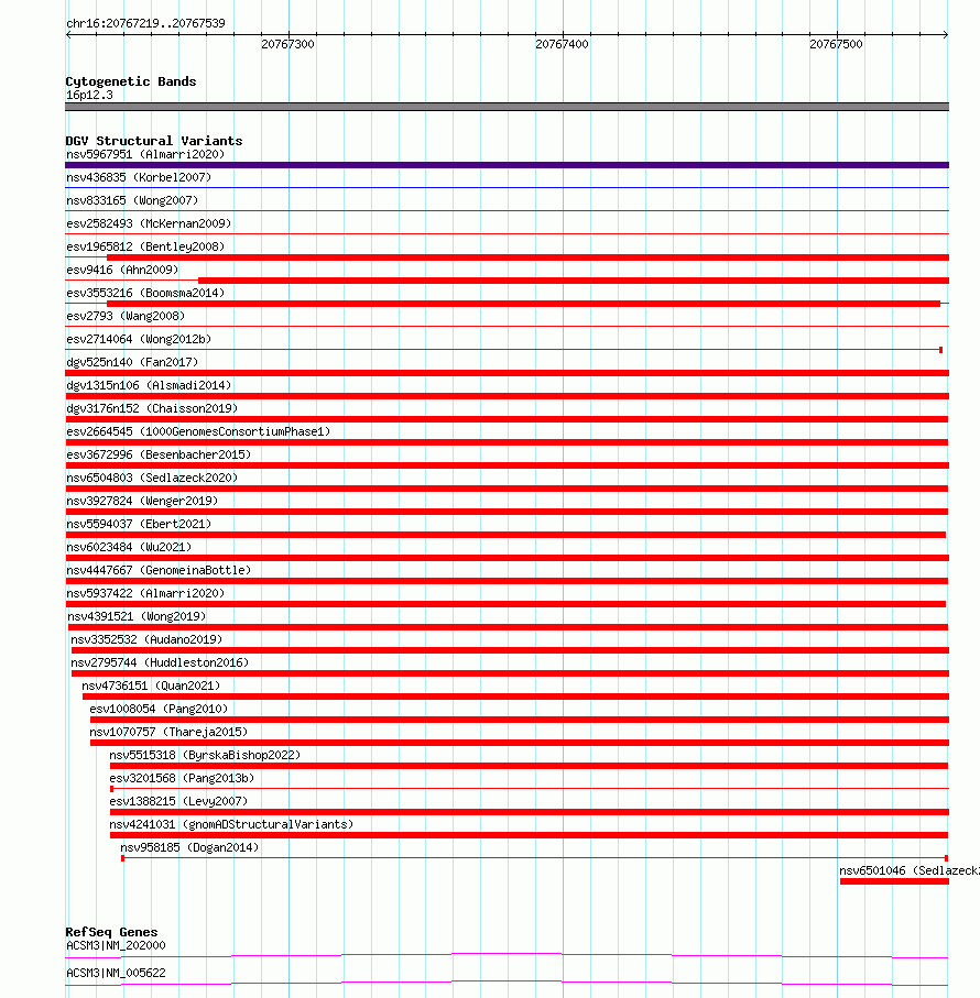 Variant DetailsVariant: esv2664545 | Internal ID | 9930650 | | Landmark | | | Location Information | | | Cytoband | 16p12.3 | | Allele length | | Assembly | Allele length | | hg38 | 321 | | hg19 | 321 |