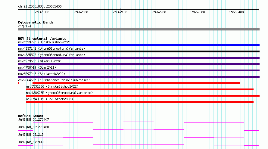 Variant DetailsVariant: esv2664665| Internal ID | 9930770 | | Landmark | | | Location Information | | | Cytoband | 21q21.3 | | Allele length | | Assembly | Allele length | | hg38 | 619 | | hg19 | 619 |
