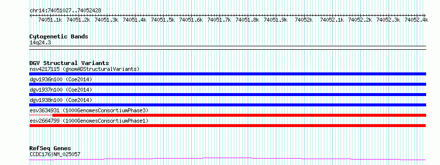 Variant DetailsVariant: esv2664799| Internal ID | 9584218 | | Landmark | | | Location Information | | | Cytoband | 14q24.3 | | Allele length | | Assembly | Allele length | | hg38 | 1402 | | hg19 | 1402 |